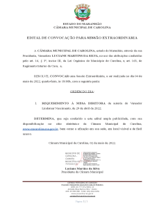 A Presidente da Câmara Municipal de Carolina, Vereadora Luciane Martins da Silva, resolve, por meio do Edital de convocação para Sessão Extraordinária, de 02 de maio de 2022, convocar uma Sessão Extraordinárias para o dia 04/05/2022, às 18:00hs.